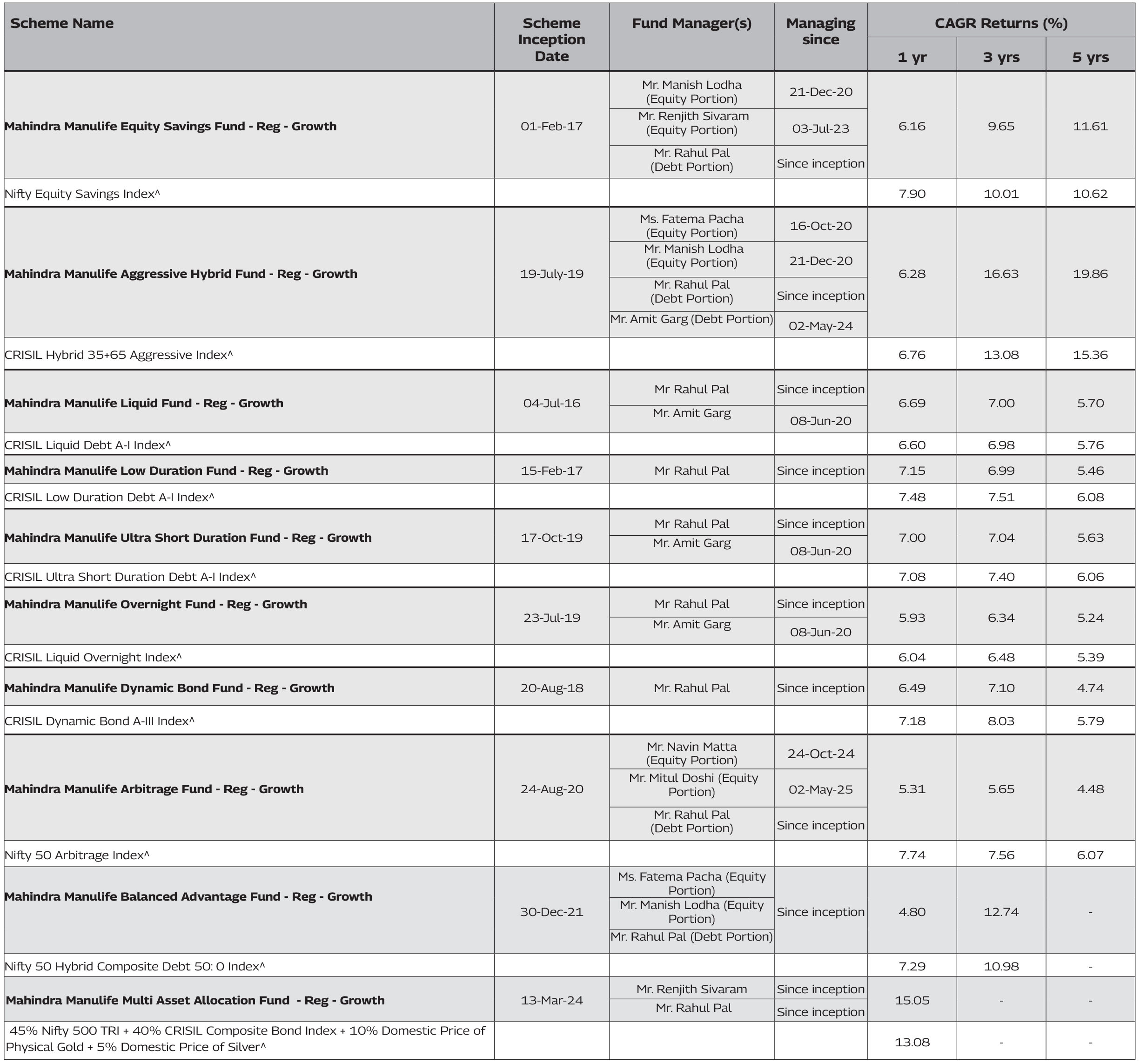 The performance details provided above are of Growth Option under Regular Plan. Different Plans i.e Regular Plan and Direct Plan under the scheme has different expense structure. Mr. Rahul Pal manages 11 schemes of Mahindra Manulife Mutual Fund. The performance data for the schemes which have not completed one year has not been provided.