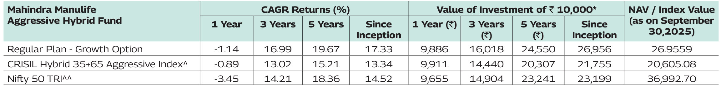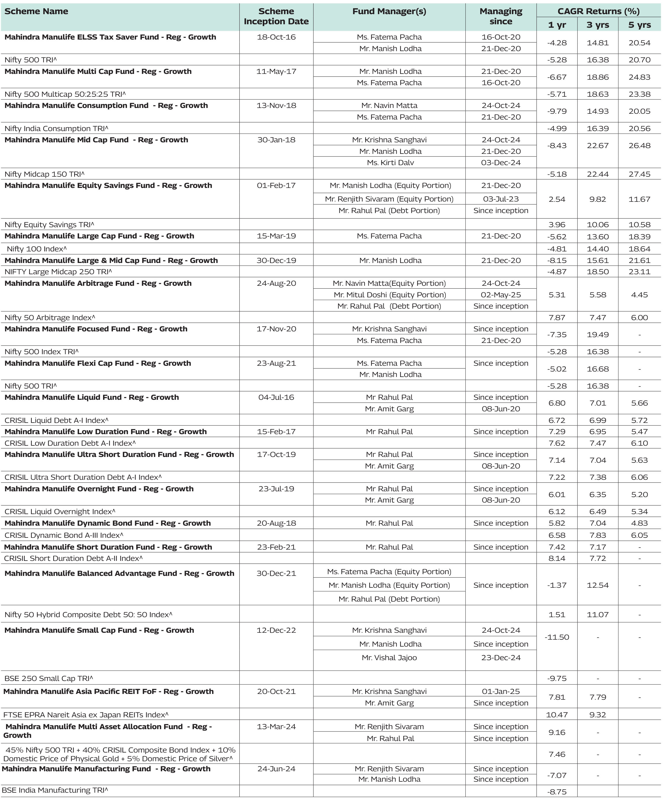 The performance details provided above are of Growth Option under Regular Plan. Different Plans i.e Regular Plan and Direct Plan under the scheme has different expense structure. Mr. Rahul Pal manages 11 schemes, Ms. Fatema Pacha manages 8 schemes, Mr. Manish Lodha manages 10 schemes each of Mahindra Manulife Mutual Fund and Mr. Amit Garg is managing 5 schemes of Mahindra Manulife Mutual Fund.The performance data for the schemes which have not completed one year has not been provided.