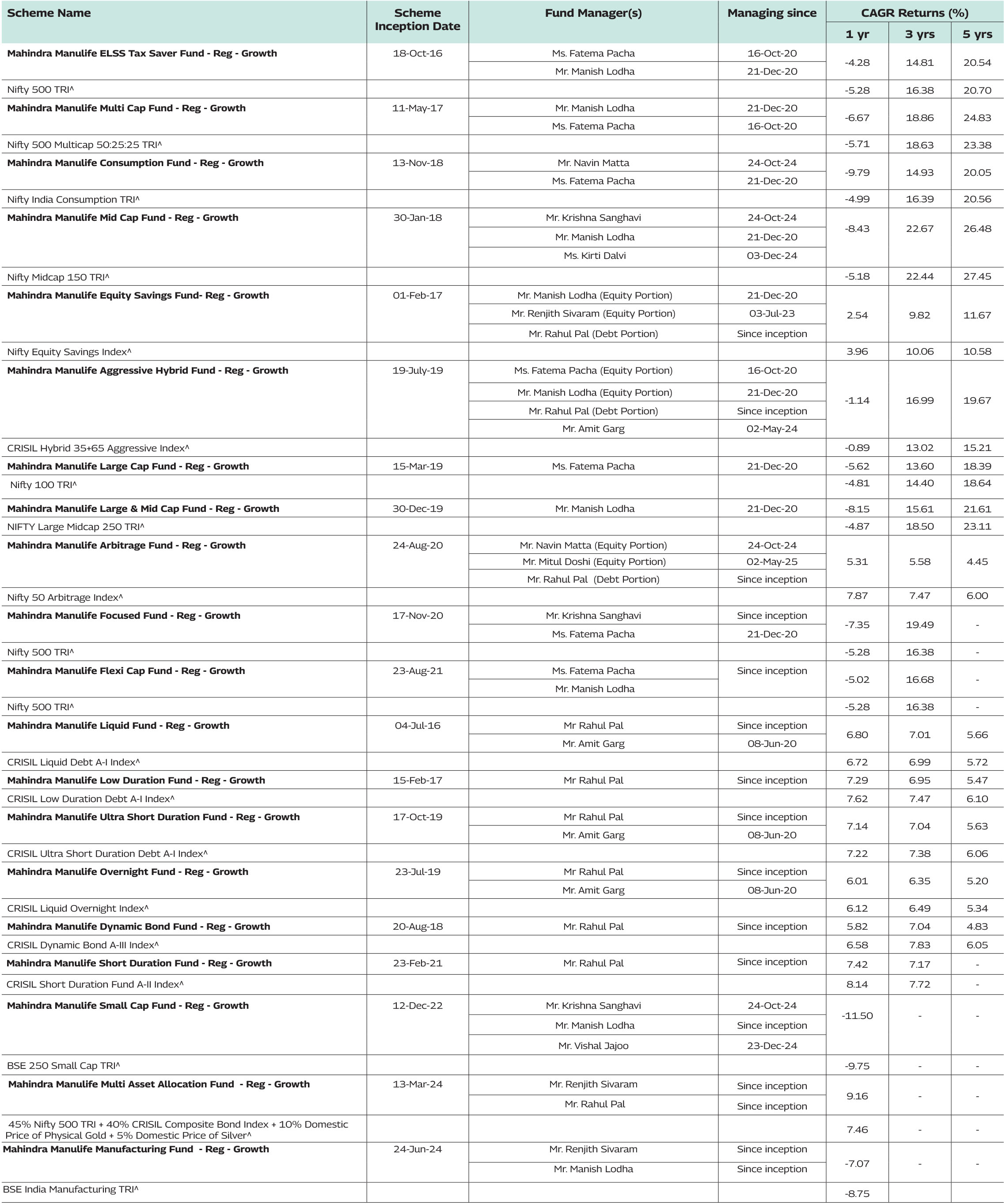 The performance details provided above are of Growth Option under Regular Plan. Different Plans i.e Regular Plan and Direct Plan under the scheme has different expense structure. Mr. Rahul Pal manages 11 schemes, Mr. Manish Lodha manages 10 schemes and Ms. Fatema Pacha manages 8 schemes each of Mahindra Manulife Mutual Fund. The performance data for the schemes which have not completed one year has not been provided.