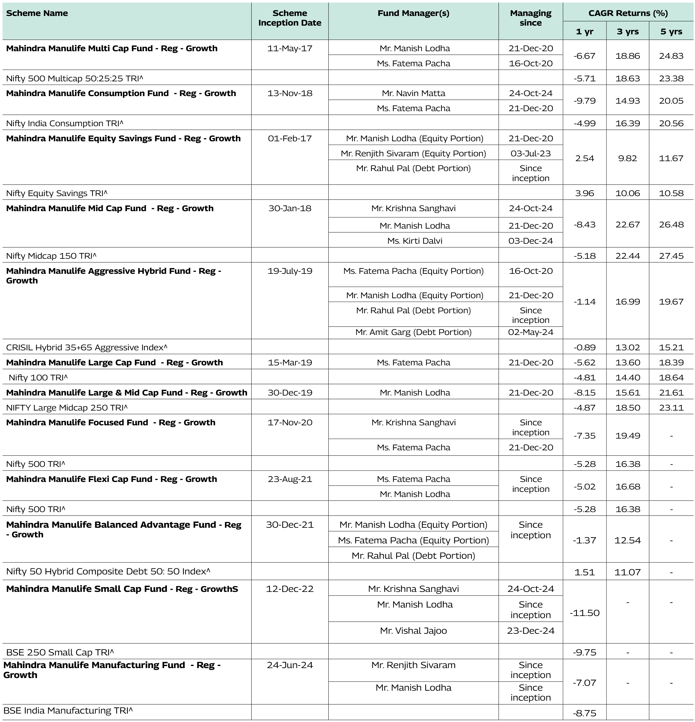 Mr. Manish Lodha manage 10 schemes each of Mahindra Manulife Mutual Fund. The performance data for the schemes which have not completed one year has not been provided.