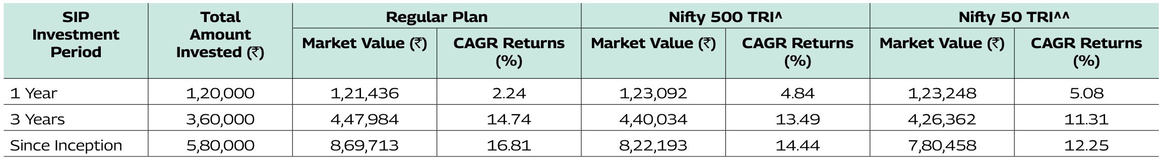 Past performance may or may not be sustained in future and should not be used as a basis of comparison with other investments. Returns greater than 1 year period are compounded annualized. For SIP returns, monthly investment of equal amounts invested on the 1st business day of every month has been considered. CAGR Returns (%) are computed after accounting for the cash flow by using the XIRR method (investment internal rate of return).
