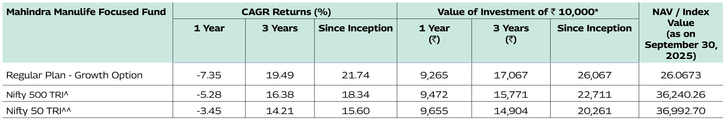 The performance details provided above are of Growth Option under Regular Plan. Different Plans i.e Regular Plan and Direct Plan under the scheme has different expense structure. Mr. Krishna Sanghavi manages 6 scheme and Ms. Fatema Pacha manages 8 schemes of Mahindra Manulife Mutual Fund. The performance data for the schemes which have not completed one year has not been provided.