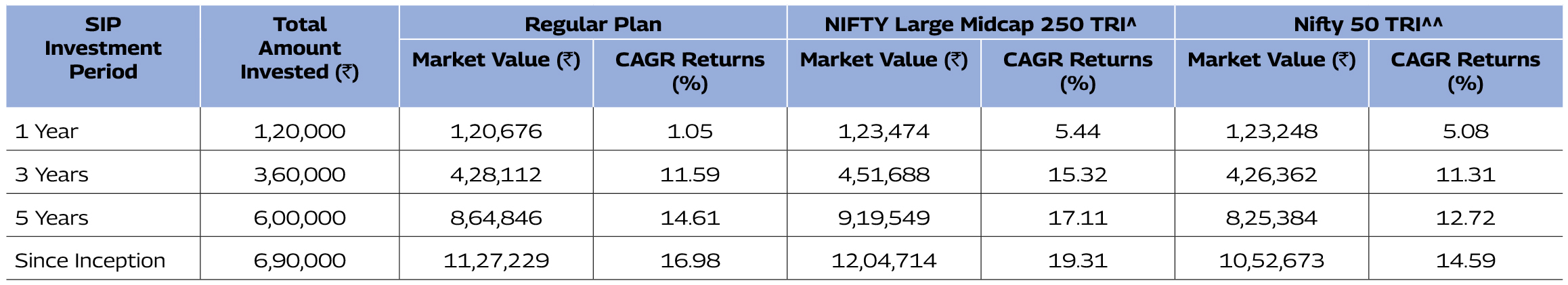 Past performance may or may not be sustained in future and should not be used as a basis of comparison with other investments. Returns greater than 1 year period are compounded annualized. For SIP returns, monthly investment of equal amounts invested on the 1st business day of every month has been considered. CAGR Returns (%) are computed after accounting for the cash flow by using the XIRR method (investment internal rate of return).