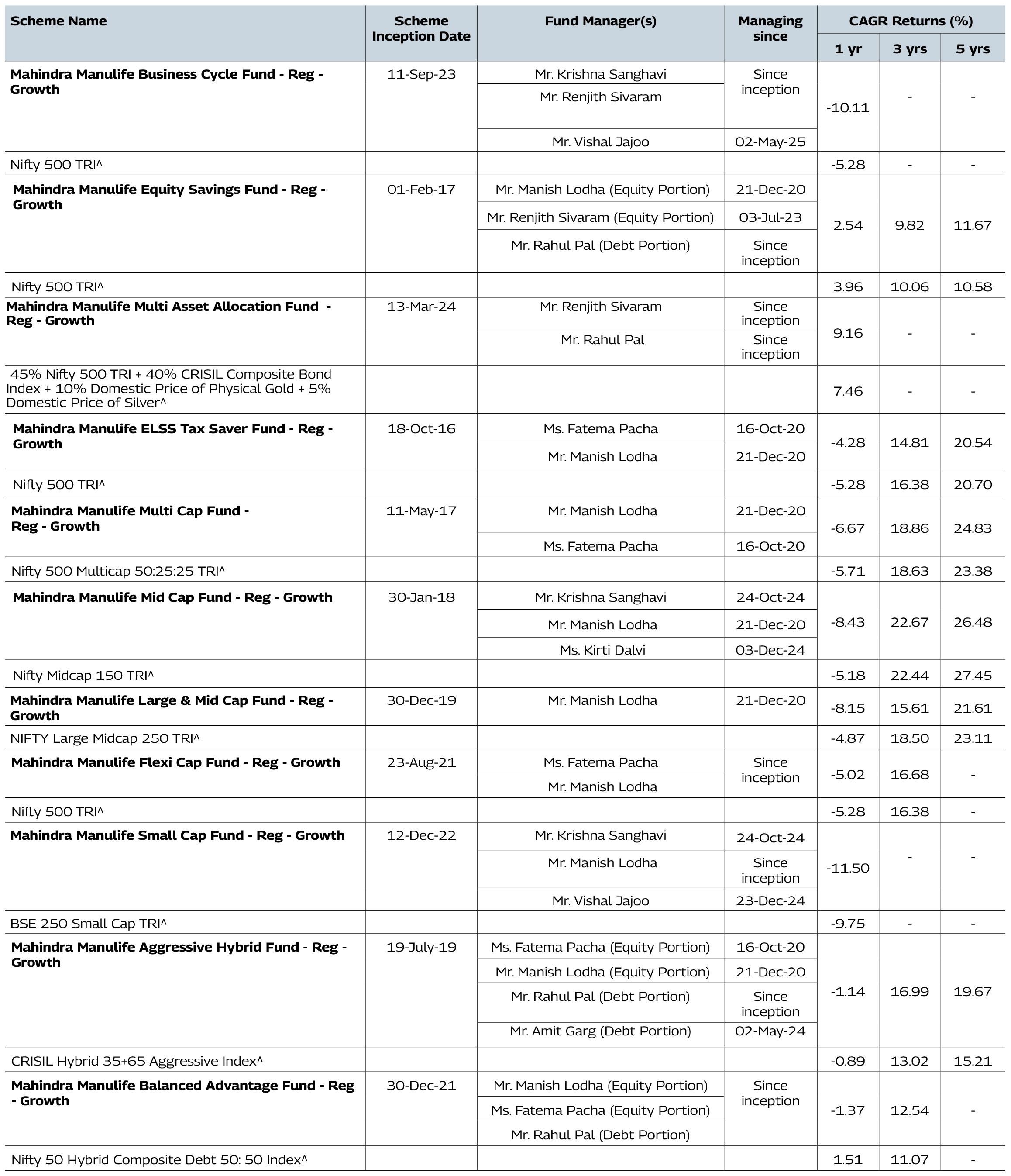 schemes of Mahindra Manulife Mutual Fund. The performance data for the schemes which have not completed one year has not been provided.