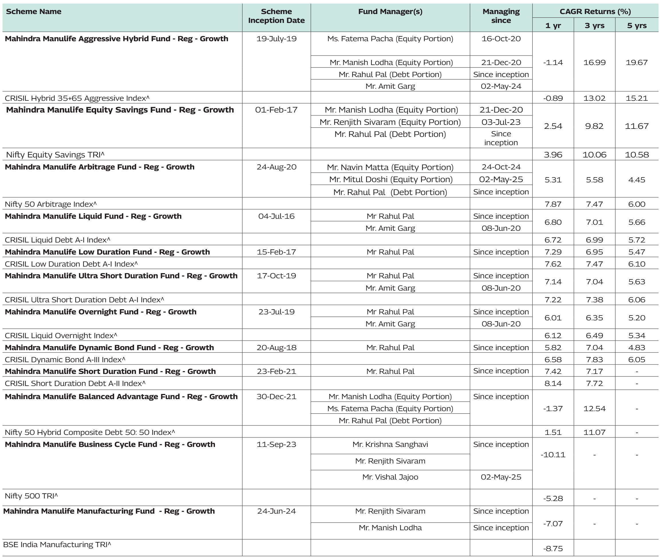 The performance details provided above are of Growth Option under Regular Plan. Different Plans i.e Regular Plan and Direct Plan under the scheme has different expense structure. Mr. Renjith Sivaram manages 4 schemes and Mr. Rahul Pal manages 11 schemes each of Mahindra Manulife Mutual Fund. The performance data for the schemes which have not completed one year has not been provided.