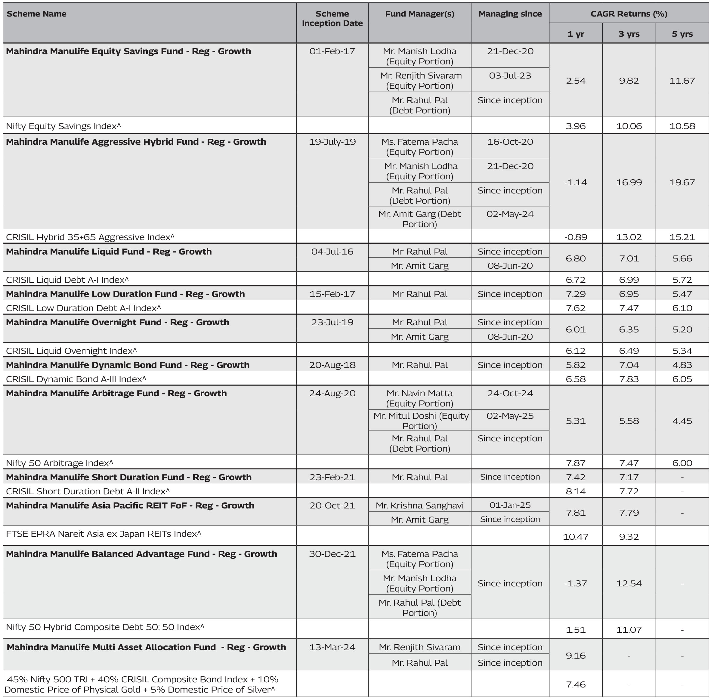 Mahindra Manulife Mutual Fund and Mr. Amit Garg manages 5 schemes of Mahindra Manulife Mutual Fund. The performance data for the schemes which have not completed one year has not been provided.