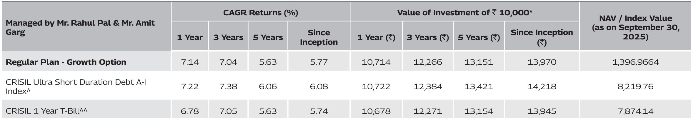 Since inception returns of the scheme is calculated on face value of Rs. 1,000 invested at inception. The performance details provided above are of Growth Option under Regular Plan. Different Plans i.e Regular Plan and Direct Plan under the scheme has different expense structure. *Based on standard investment of Rs. 10,000 made at the beginning of the relevant period. Mr Amit Garg is managing this scheme since June 8, 2020.