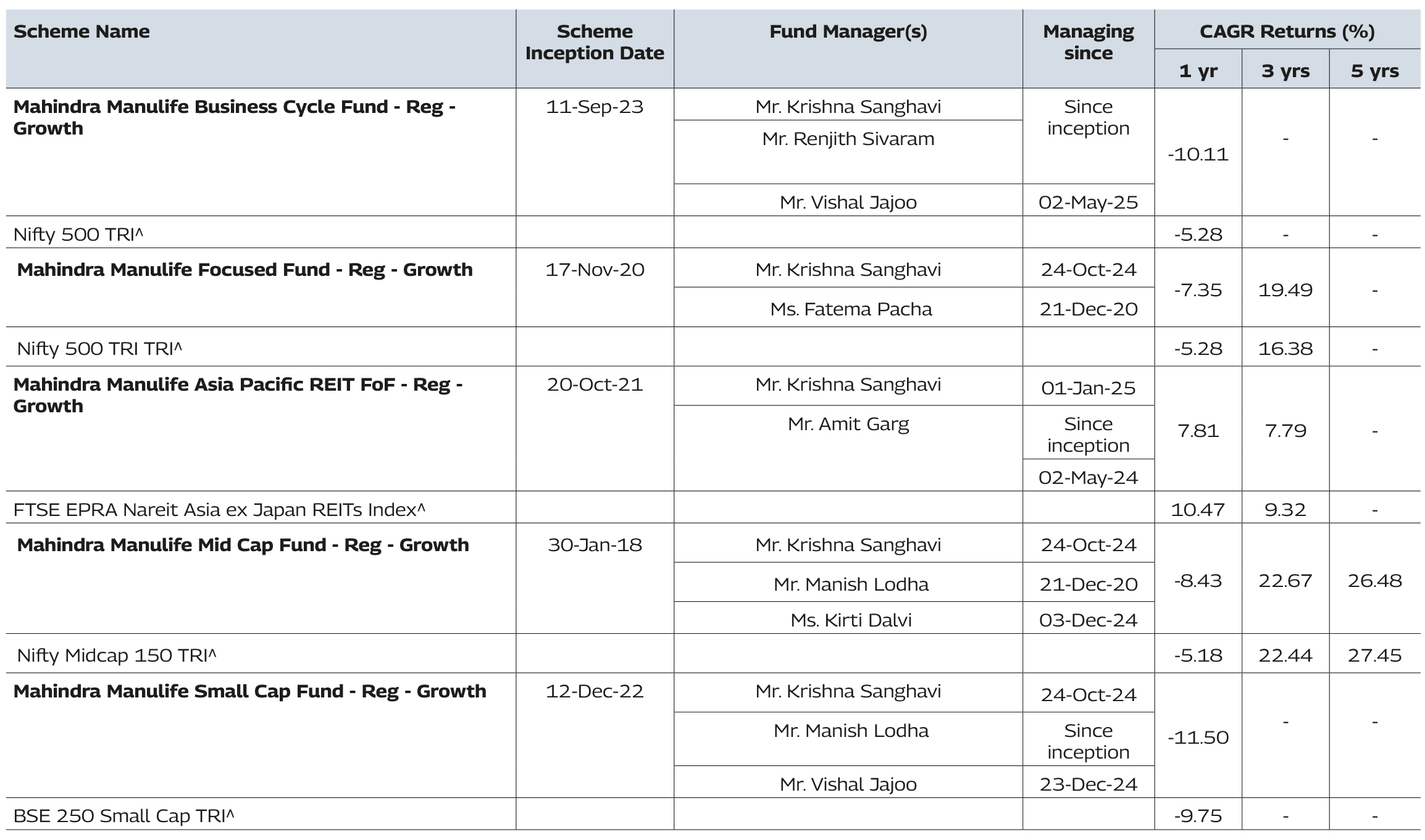 Past performance may or may not be sustained in future and should not be used as a basis of comparison with other investments. The performance details provided above are of Growth Option under Regular Plan. Different Plans i.e Regular Plan and Direct Plan under the scheme has different expense structure. Mr. Krishna Sanghavi manages 6 schemes and Mr. Vishal Jajoo manages 4 schemes of Mahindra Manulife Mutual Fund. The performance data for the schemes which have not completed one year has not been provided.